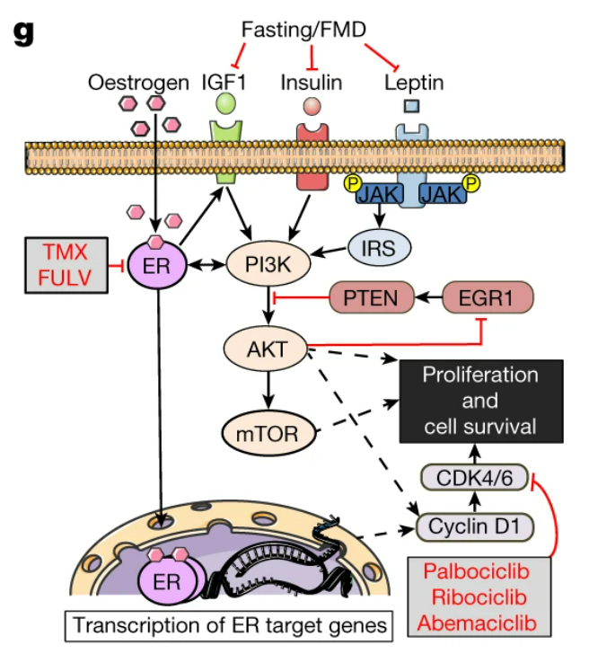 已有多项临床前研究显示,FMD能与乳腺癌治疗中常用的内分泌疗法、CDK4/6抑制剂和化疗产生协同增效性,其中在2020年登上《自然》的一项标志性研究就显示,FMD与内分泌疗法(氟维司群、他莫昔芬)和CDK4/6抑制剂的协同增效,正是通过下调胰岛素、瘦素(Leptin)和IGF-1水平来实现的[5]。