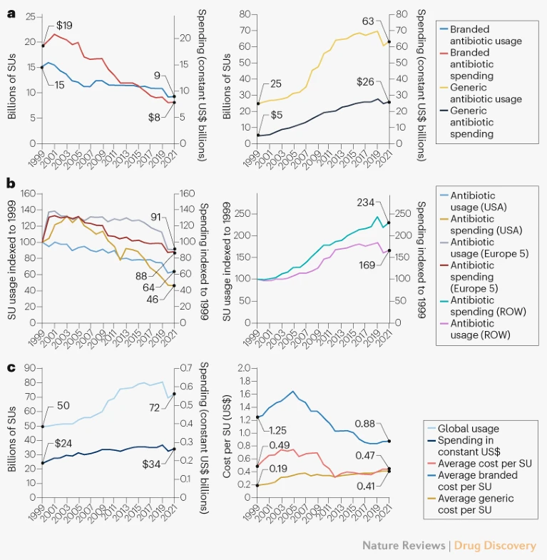 这一下降在美国尤为突出,主要是由于仿制药的可及性增加,以及成功引入了对抗抗生素耐药性的管理计划,从而降低了抗生素的使用(图1b)。欧洲主要市场尽管不太明显,也出现了类似的趋势。