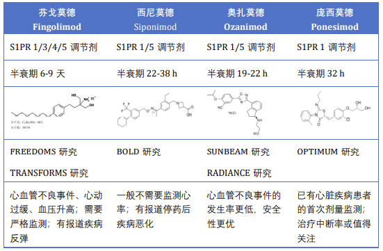 鞘氨醇-1-磷酸受体(S1PR)存在于中枢神经系统(CNS)特定细胞的表面,驱动 MS 患者 CNS 功能损伤。自2010年,S1P受体调节剂芬戈莫德(fingolimod)获批用于MS,但其靶向的是受体1/3/4/5,S1P3受体与心血管相关,导致心血管不良反应明显,胃肠道反应等也饱受质疑。提高靶向选择性,改善药物半衰期、提高安全性是新一代S1P受体调节剂药物开发需优化解决的问题。除了每种药物各自的特点,医学上也关注到S1PR调节剂一些可能的共性问题,如停药之后的病症反弹或恶化、心血管系统不良反应、皮肤癌等,随着药物上市应用时间的延长,这些长期用药安全性仍待持续跟踪。
