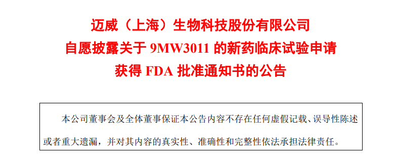 迈威生物:美国FDA批准9MW3011新药临床试验申请