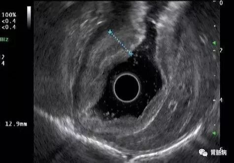 在超声内镜评估过程中,其中超声图像显示胃壁第三层超声结构(黏膜下层)可见星点状中断征象,符合革囊胃(也叫皮革胃,浸润性胃癌)的诊断!