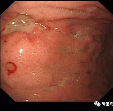 胃镜提示胃黏膜皱襞粗大僵硬伴溃疡形成。