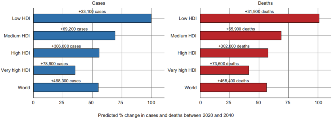 按人类发展指数组别划分之后的预测结果显示,高人类发展指数国家的病例和死亡绝对增幅最高,到2040年,每年病例增加55.7%(30.6万例),死亡人数增加57.6%(30.2万例)。