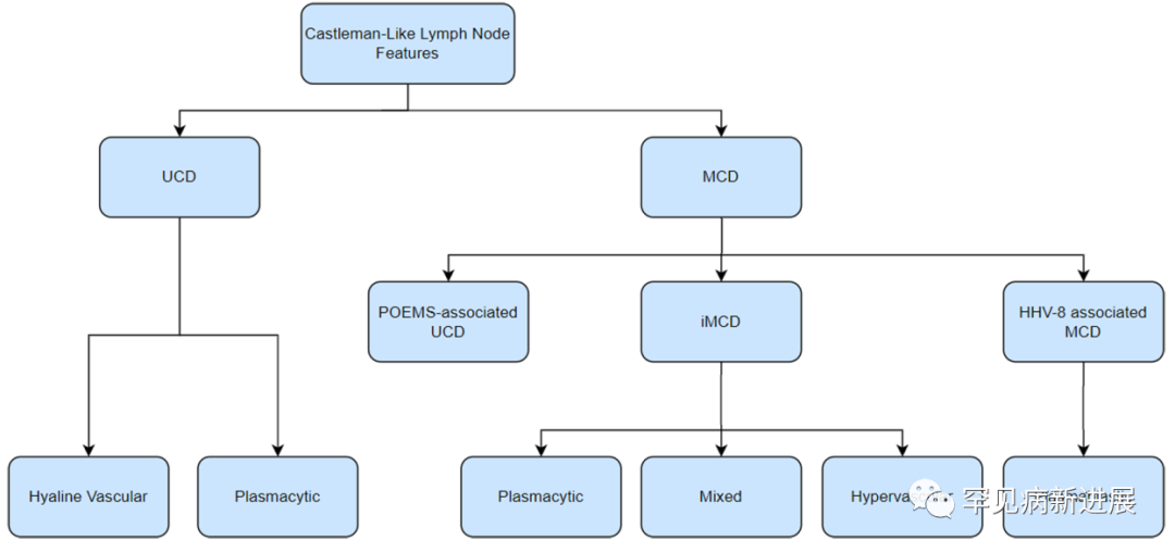 根据淋巴结分布与器官受累部位,CD可分为UCD(单中心Castleman病)和MCD。UCD仅累及单个淋巴结区,全身症状反应较轻,总体预后较好。MCD累及多个淋巴结区域,呈全身症状,总体预后较差。根据病因和临床特点,MCD进一步分为人疱疹病毒8(HHV-8)相关MCD,皮肤变化(POEMS)相关MCD和特发性MCD(iMCD)。