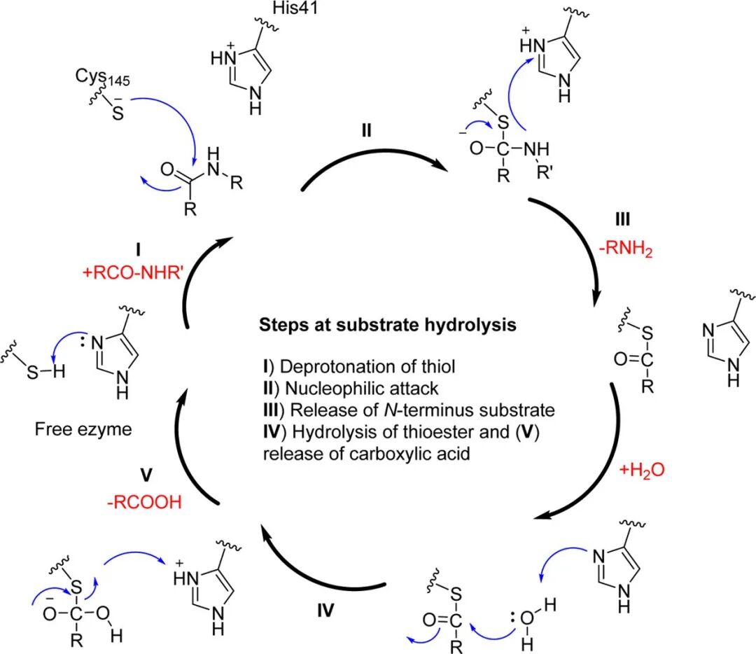 图4. SARS/SARS-CoV-2的3CL蛋白酶的底物水解机理。From:JMC 2016
