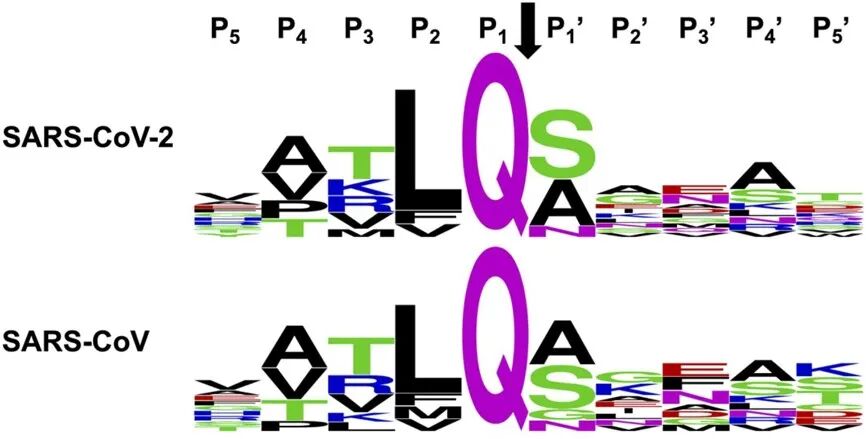 通过对UniProt数据库中报道的pp1ab polyprotein序列进行分析,可以发现SARS和SARS-CoV-2的3CL蛋白酶的底物有特异性的P1(Gln,Q)和高度保守的P2位点(Leu,L)。P3、P4则分别以T/K/R/V和A/V/P/T为主。