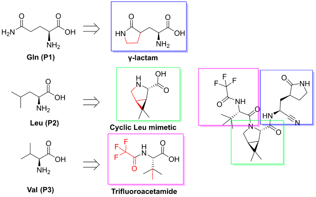 2、从药化角度出发,Gln和Leu通常会被改造为环状,借鉴了感冒药rupintrivir的γ-lactam片段和HCV NS3/4A蛋白酶抑制剂的氮杂双环;