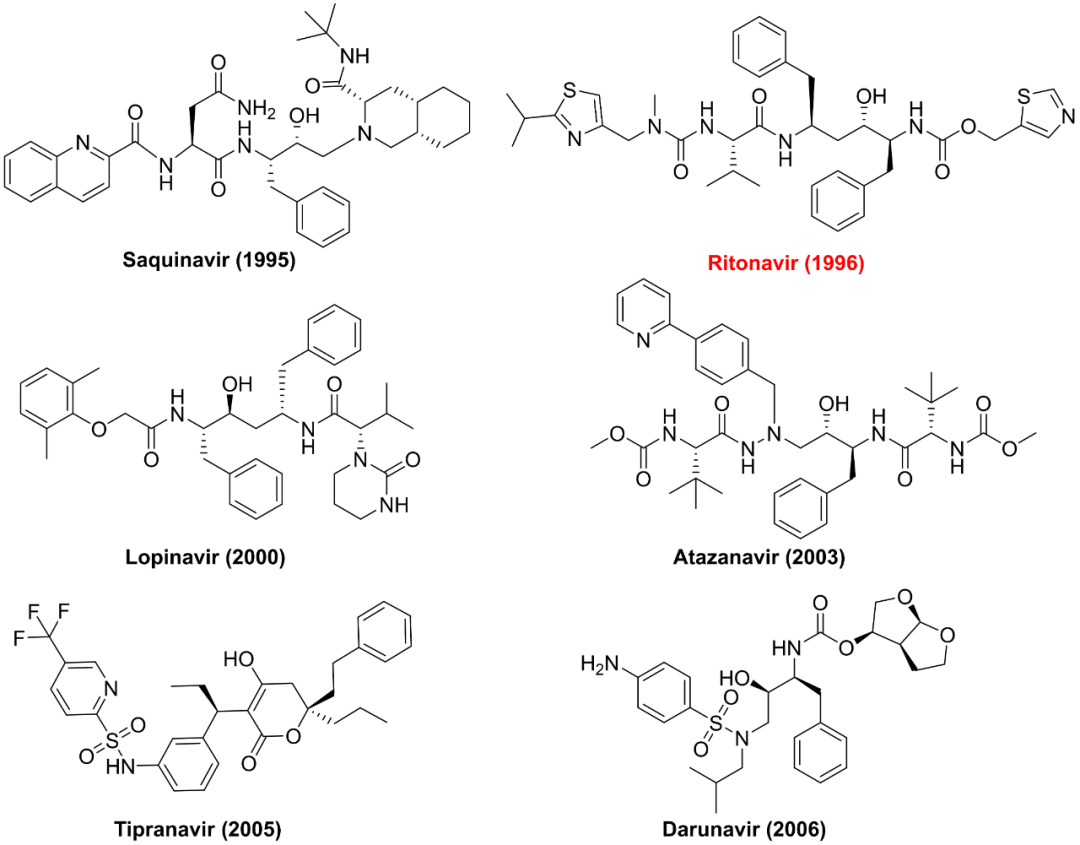 图1.部分FDA获批上市的HIV蛋白酶抑制剂的分子结构和相应的上市年份。