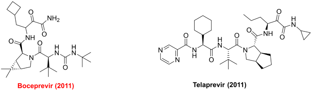 图2.FDA获批上市的HCV NS3/4A蛋白酶抑制剂的分子结构和相应的上市年份(由于后来有更好的治疗药物上市,都已停止生产)。