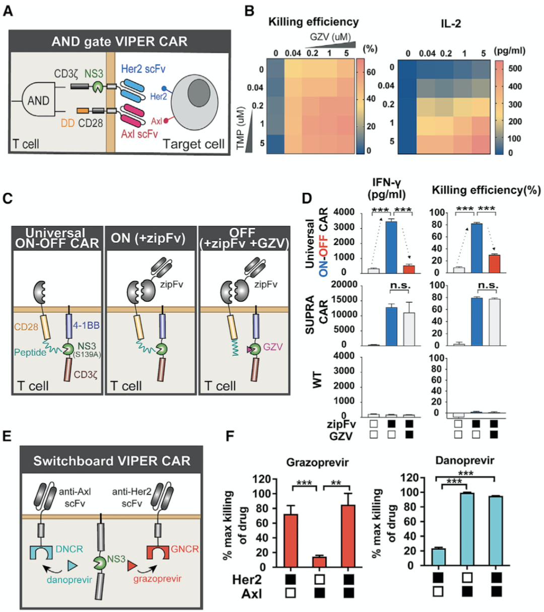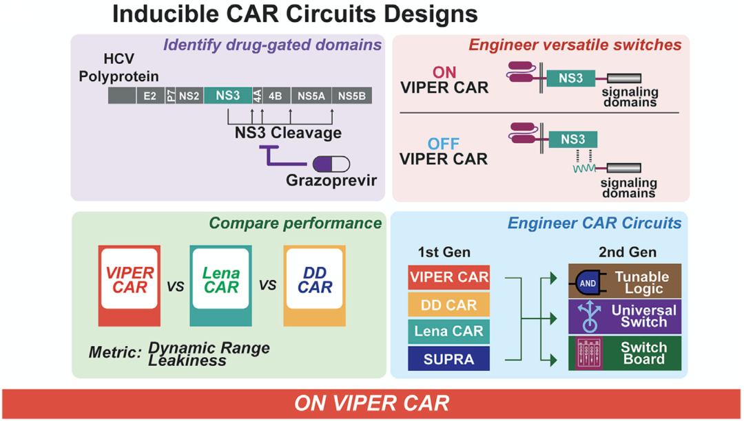 具体来说,他们在CAR-T细胞中引入丙肝病毒非结构蛋白3(NS3)蛋白酶,利用抑制NS3蛋白酶活性的药物,通过多种不同结构设计的VIPER CAR系统,实现对CAR-T细胞活性“ON”和“OFF”的可逆调节。