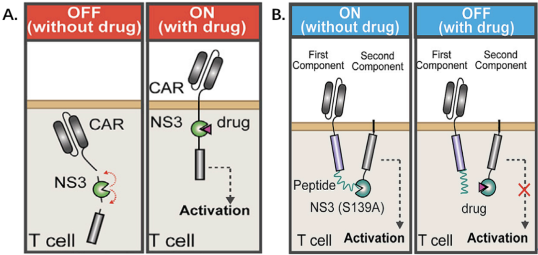 OFF系统(B)是两个分离元件,将胞外抗原识别结构域与胞内CD3ζ结构域分别置于两个分离的元件,通过NS3和NS3结合肽连接。在不添加药物的情况下,NS3与靶向肽结合,连接两个分离元件,形成完整的CAR信号转导;有药物时,NS3被竞争性结合,CAR不完整,T细胞不能被激活(即添加药物时,系统处于“OFF”的状态)。