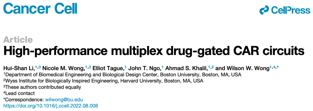 [3].Li HS, Wong NM, Tague E, Ngo JT, Khalil AS, Wong WW. High-performance multiplex drug-gated CAR circuits [published online ahead of print, 2022 Aug 26]. Cancer Cell. 2022;S1535-6108(22)00372-5. doi:10.1016/j.ccell.2022.08.008