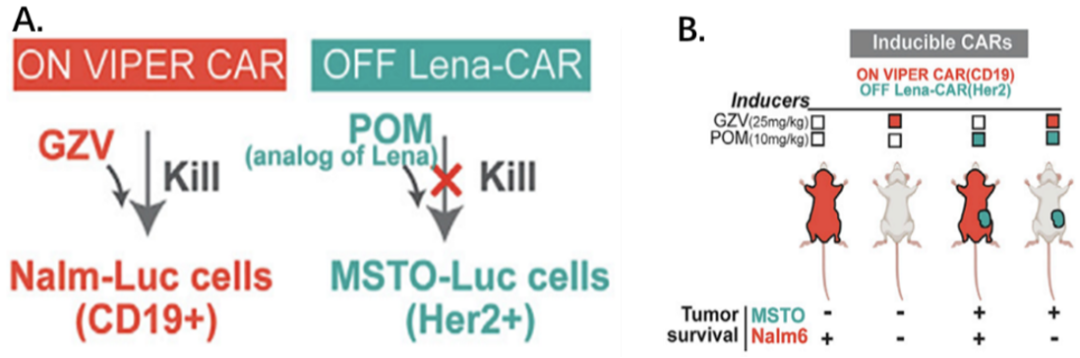 另外,鉴于VIPER CAR与其他临床相关药物门控CARs可以兼容,他们构建了靶向CD19和Her2的双靶向正交调控CAR。利用GZV调控的靶向CD19+细胞的“ON” VIPER CAR,联合POM(泊马度胺,来那度胺类似物)调控的靶向Her2+细胞的“OFF” VIPER CAR,通过两种药物的不同组合给药方式,实现了两种药物控制的、相互独立的双靶向抗肿瘤作用。