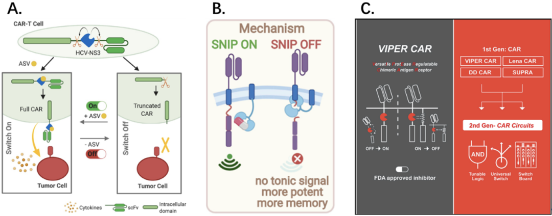 近期,由波士顿大学Wilson W. Wong领衔的研究团队,提出了一系列由口服抗肝炎病毒药物调控的多功能蛋白酶调节CAR(VIPER CAR)系统[3]。
