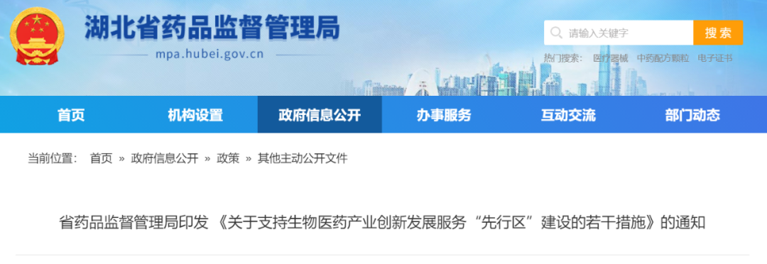 为贯彻落实我省加快建设全国构建新发展格局先行区的战略部署,全面打造更优营商环境,更高水平促进生物医药产业创新发展,现提出以下措施:一、支持药械创新研发。建立创新型药械研发全程跟踪服务机制,实行组团式“一对一”帮扶和优先审评核查、优先检验检测、优先许可审批。对进入临床试验的创新药,可采取告知承诺制核发《药品生产许可证》。对高端医疗器械注册,建立临床试验方案制定、质量管理体系核查等事前辅导机制,推进审评重心向产品研发阶段前移。支持本省医药企业研发替代进口原料药,解决原材料“卡脖子”问题。二、支持中药传承创新。允许中药饮片生产企业采购我省中药材产地加工(趁鲜切制)目录中的品种,允许中药生产企业在中药材产地增加异地车间。支持本省企业开展中药配方颗粒国标和省标制定,发展道地药材配方颗粒大品种。支持培育“十大楚药”和“五大特色药材”。优化医疗机构应用传统工艺配制中药制剂备案管理,压缩技术审查和现场检查时限。简化医疗机构中药制剂调剂使用审批程序,免于技术审评,直接办理审批。三、支持产业向鄂转移。采取政策咨询、技术服务和优先审批等措施,支持外省企业来鄂投资兴办医药产业,支持外省大型医药企业将总部迁至我省或设立第二总部。对外省药品上市许可持有人将有关产品变更到我省的,可免于提交转出方省级药品监管部门出具的同意受托意见。对跨省兼并重组隶属于同一集团或同一法定代表人的关联企业,在鄂申报第二类医疗器械注册时,产品无实质改变、符合现行法律法规及强制性标准且完成工艺验证、产品检验合格的,可采用原注册资料申报,技术审评压缩至5个工作日。四、支持医药外贸发展。支持本省医药企业申请美国、欧盟等国家和地区的认证、世界卫生组织的预认证,推动优质药械产品取得国际市场通行证。支持境外药品持有人代理机构在我省自贸区落户,可自行设立仓库或委托药品第三方物流企业储存配送。在武汉口岸药检所设立办事窗口,为企业提供药品进口备案和检验一站式服务。完善药品网络销售监管措施,支持市场主体开展跨境电商零售进口药品及医疗器械业务。五、支持企业兼并重组。支持医药企业跨地区、跨所有制兼并重组,提高产业集中度和行业竞争力。优化企业兼并重组后所涉许可证审批流程,简化办理变更手续。支持省内药品生产企业兼并重组外省关联的原料药企业,完善产业链和供应链。允许同一法定代表人市场主体在同一质量管理体系下共享仓储运输设施设备,可分别取得药品批发和零售连锁经营许可。六、支持产学研医对接。搭建政产学研医平台,发布行业最新动态、优质资源和服务供求等信息,促进高等院校、科研院所、医药企业、临床试验机构、第三方服务机构等交流与合作,推动资源整合、优势互补。支持武汉大学、华中科技大学两个国家药监局医疗器械监管科学研究基地和省内4个国家药监局重点实验室与医药企业深度合作,推动科研成果尽快转化、裂变增值。七、优化许可检查机制。建立健全免于检查和合并检查事项清单,完善审评、检查、检验、审批联动机制,推进关联事项同时申报、合并检查、结果互认、并联审批,降低企业制度性交易成本。企业申报《药品生产许可证》(B证),经风险评估可免于现场检查。除申请药品经营许可证核发(换发)外,药品零售连锁总部其他变更事项不再抽查门店。对一年内在医疗器械原生产地址通过同类(二级产品类别)产品注册质量体系核查,或通过生产许可全项核查的首次注册事项,可免于现场检查或仅进行样品真实性核查。八、优化药械检验服务。完善药械检验“业务预咨询”和“资料预审查”服务机制。省药检院为企业药品注册、标准提升等提供检验和复核服务。省器械院开辟“研检同行”通道,扩增医学影像、有源手术、无源植入、人工智能、无线医疗等领域的检验能力。支持第三方检验检测机构取得医疗器械领域国家资质认证,并认可其出具的检验报告。九、实施包容审慎监管。依法审慎决定对新技术、新产业、新业态、新模式等涉嫌违法违规的企业采取行政强制措施。综合运用行政指导、行政告诫、行政约谈、教育说理等手段,督促企业落实主体责任。完善轻微违法行为不予处罚清单,对受疫情影响产生的轻微违法行为并及时改正,没有造成危害后果的,不予行政处罚。完善信息公开和失信行为纠正后的信用修复制度,对行政相对人处以警告、通报批评和适用简易程序作出的行政处罚信息不予公示。对符合信用修复条件的企业,可以申请提前终止公示行政处罚信息,也可以申请移出严重失信主体名单,不纳入信用联合惩戒范围。十、实施容错免责减责。按照 “三个区分开来”的总体要求,在服务生物医药产业创新发展工作中,对有关单位或者个人因推进改革、探索创新、先行先试、破解难题出现的失误或偏差,符合《湖北省容错纠错工作办法(试行)》有关规定,未造成重特大药品安全事件或引发严重群体性事件的,实施容错免责减责。