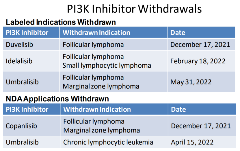 截至2023年8月,FDA撤回适应症和被NDA拒绝申请的PI3K药物药物撤市、取消研发,主要是PI3K靶点的毒性问题。根据FDA的回顾性分析,当时已上市的4款PI3K抑制剂可能引起毒性而缩短血液肿瘤患者的预期寿命。也就是说,癌细胞确实是没了,结果患者也因为药物副作用也不行了……援引FDA肿瘤卓越中心主任Richard Pazdur博士的话就是:这样的观察结果是“史无前例”的。![]()