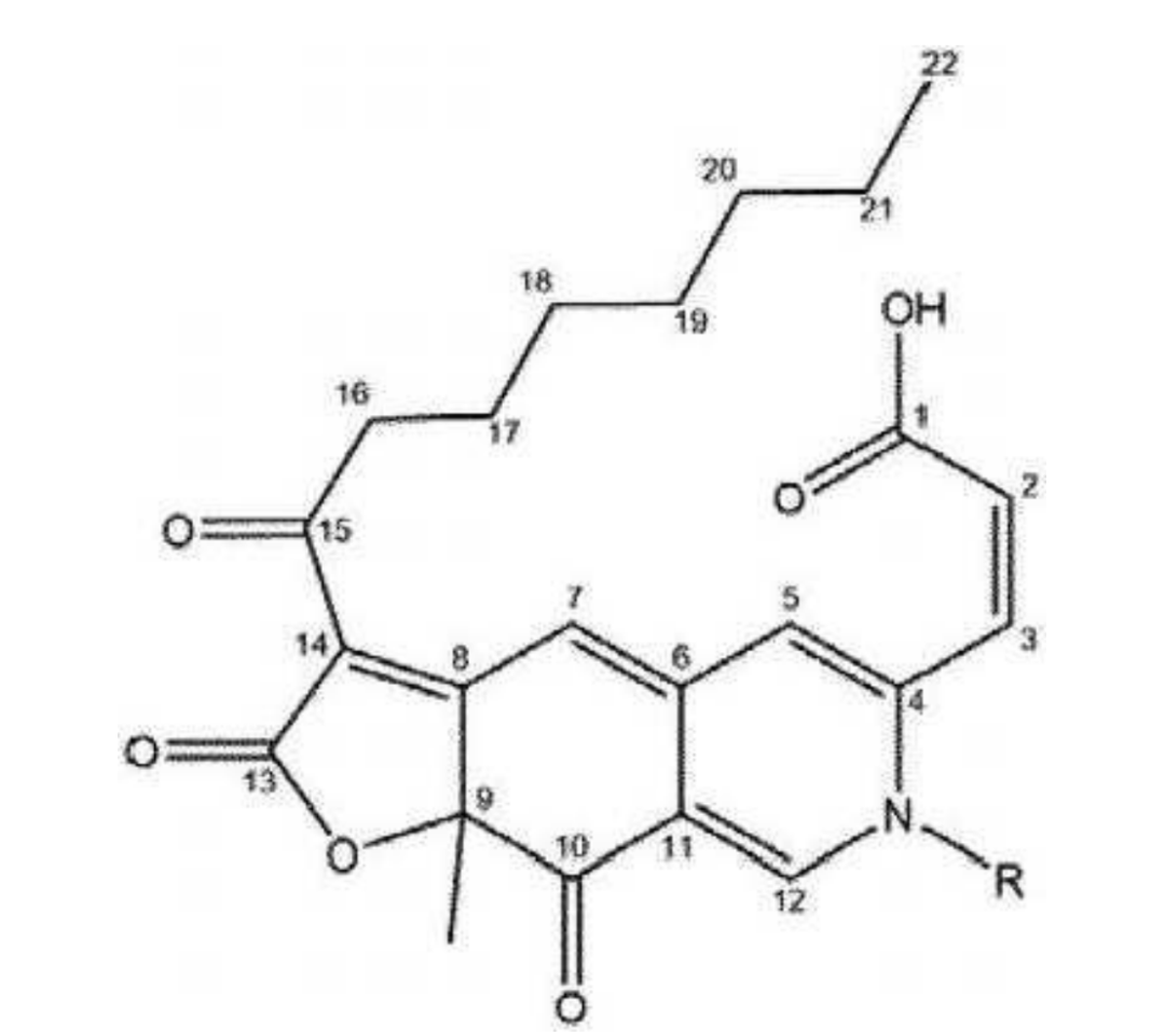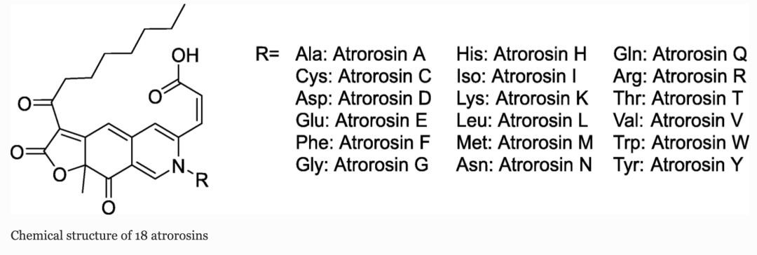根据其专利,这是一种从丝状真菌Talaromyces atroroseus中分离出来的色素混合物,主要成分名为astrorosin的新型氮杂非酮色素亚群。astrorosin具有与橙色红曲色素PP-O相似的氮杂亲酮支架,在C-1处具有羧酸基团,但独特之处在于将氨基酸掺入异色烯系统中。